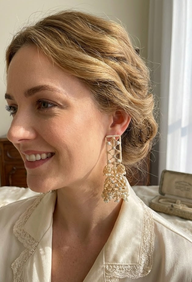 The substantial drop and traditional jhumka silhouette complement anarkalis and off-shoulder dresses with authentic Indian glamour. Perfect for brides and guests seeking jewelry that commands attention with timeless elegance.