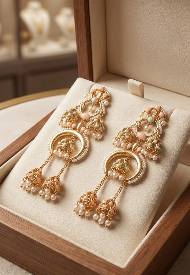 Transform your festive wardrobe with these exquisite handmade Jannat chandeliers, featuring radiant 22K gold plating that captures light with every graceful movement. Ideal for weddings, festivals, and special occasions where you desire jewelry that commands attention while maintaining timeless elegance and cultural authenticity.