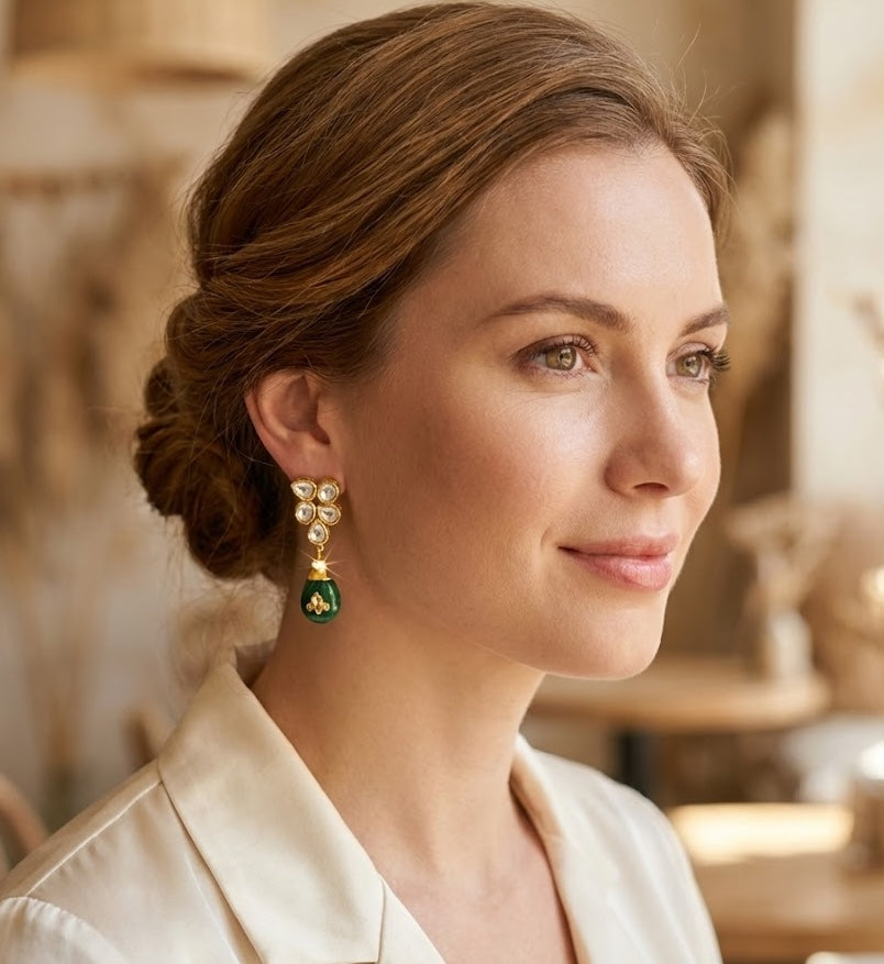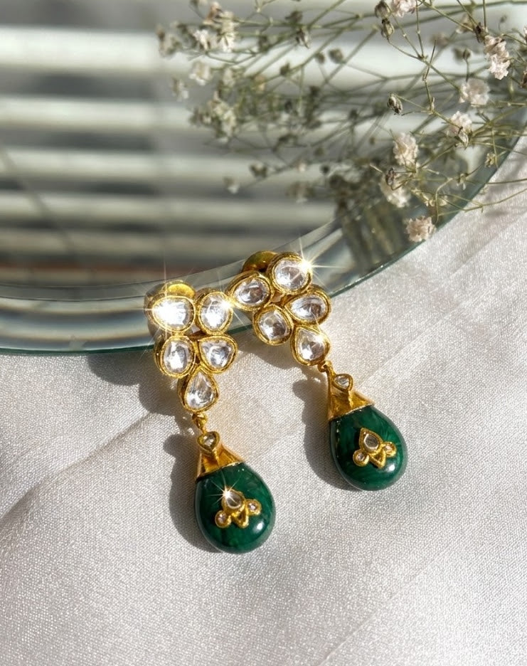 A pair of elegantly designed floral kundan studs with flawless jade stones.