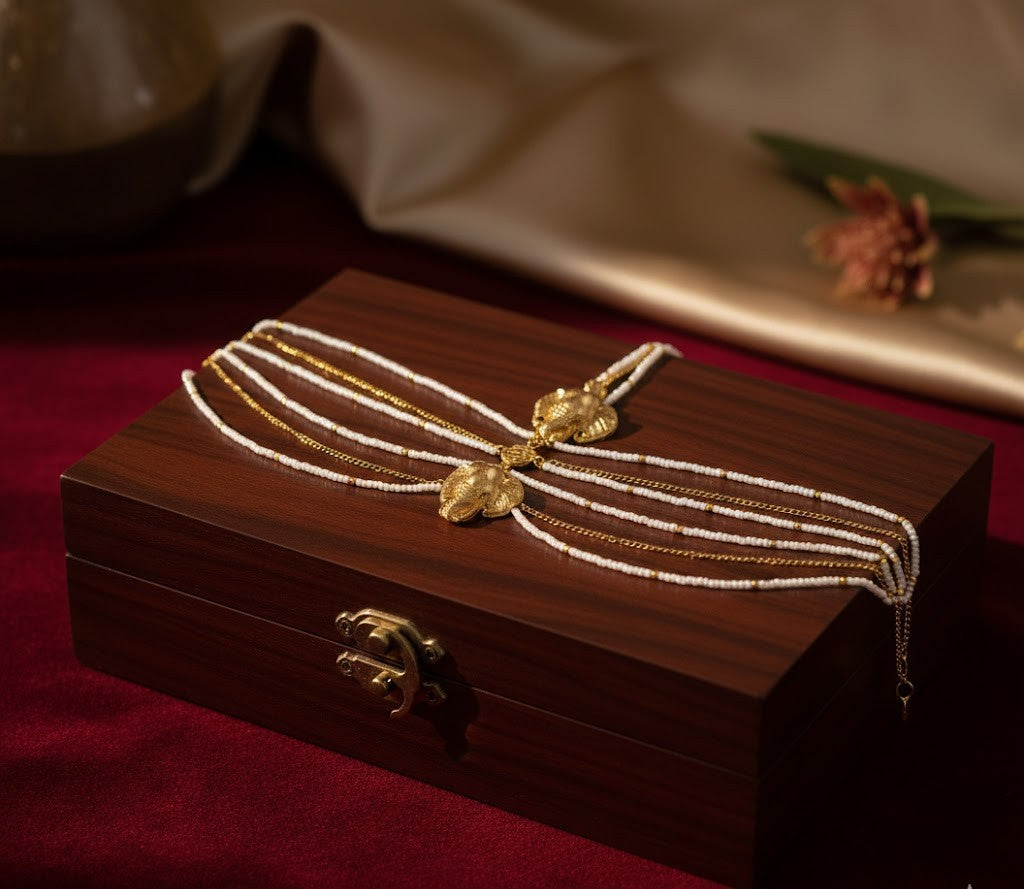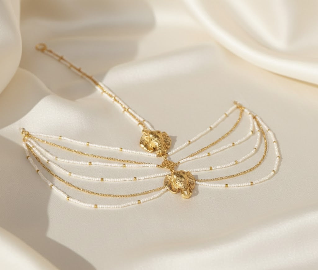 Discover the regal elegance of Gajja, a stunning matha teeka inspired by the majestic royal elephant. This exquisite piece captures the essence of royalty and timeless tradition, transforming you into a vision of grace and sophistication. Each detail reflects the grandeur and strength symbolized by the noble elephant, making it the perfect accessory for celebrations, weddings, and special occasions.