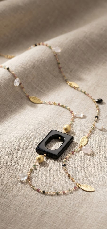 The Eternal Gemstone Majesty Necklace is a masterpiece that combines the mystique of tourmaline, the allure of moonstone, the depth of smoky quartz, and the sophistication of black onyx. Designed to add a touch of opulence to any look, this necklace is a versatile accessory that transitions seamlessly from day to night. It’s not just a piece of jewelry; it's an expression of timeless elegance and understated glamour.