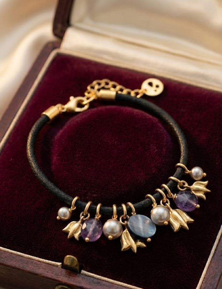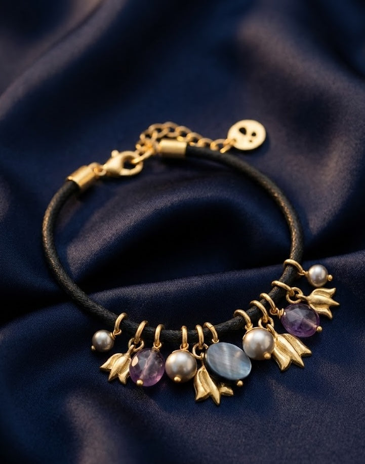 Amethyst is revered for its calming and protective properties, Pearls symbolize purity and grace, and Shell represents tranquility and protection. Expertly crafted to highlight the natural beauty of these elements, this bracelet offers a refined and serene statement. Measuring 190mm in length, it wraps gracefully around the wrist, with an additional 40mm of adjustable length ensuring a customizable and comfortable fit, perfect for both special occasions and daily elegance.