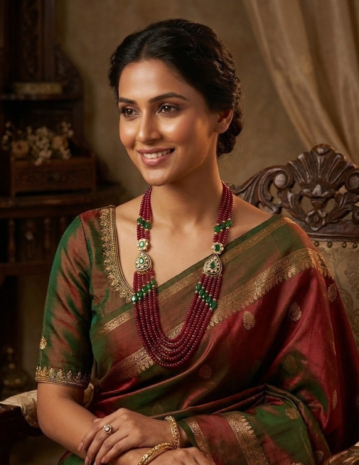 Feel traditionally stylish in this side broch necklace having precious layered rubies and emeralds.